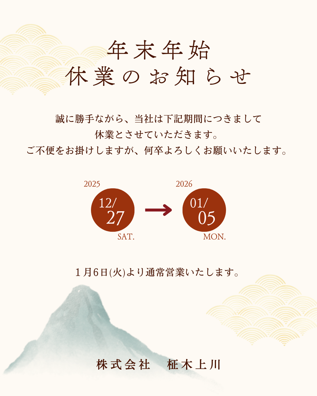 いつもお世話になっております。 当社は 2025年12月27日(土)~2026年1月5日(月)まで 年末年始のお休みをいただきます。 1月6日(火)から通常営業いたしますのでよろしくお願いします。
